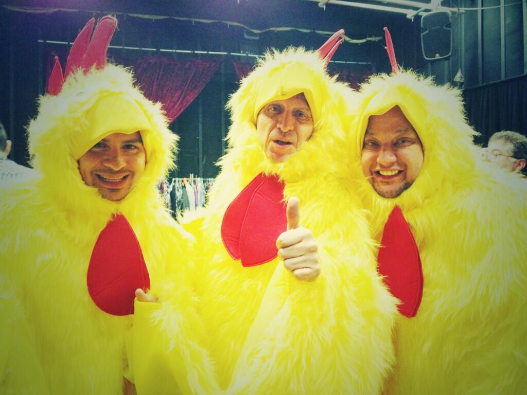 El cantante de música regional mexicana sorprendió a sus twitteros con esta imagen, vestido de pollo, junto a Alex Lora, el famoso cantante de rock y Pepe Garza, locutor, compositor, músico y mil facetas más.